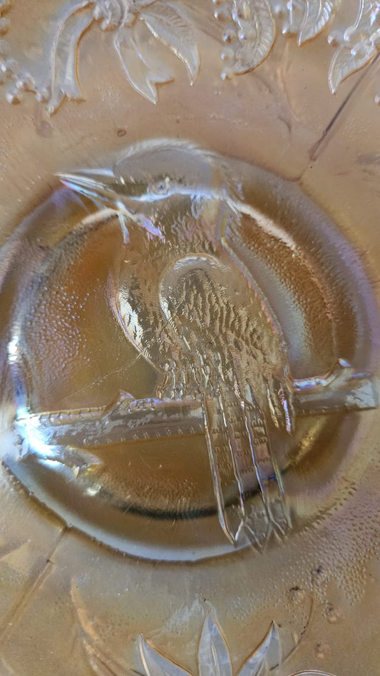 Crown Crystal Carnival glass master Bowl, Marigold Kookaburra