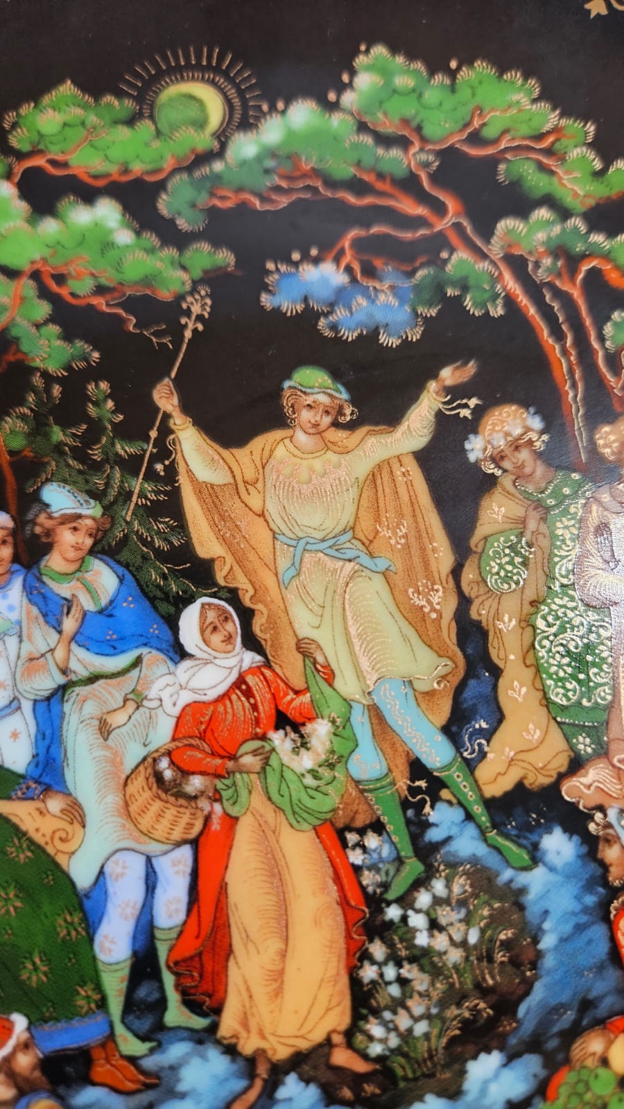 Russian Folklore Collection plate in vivid colors of reds and greens on a black background with an ornate trim.