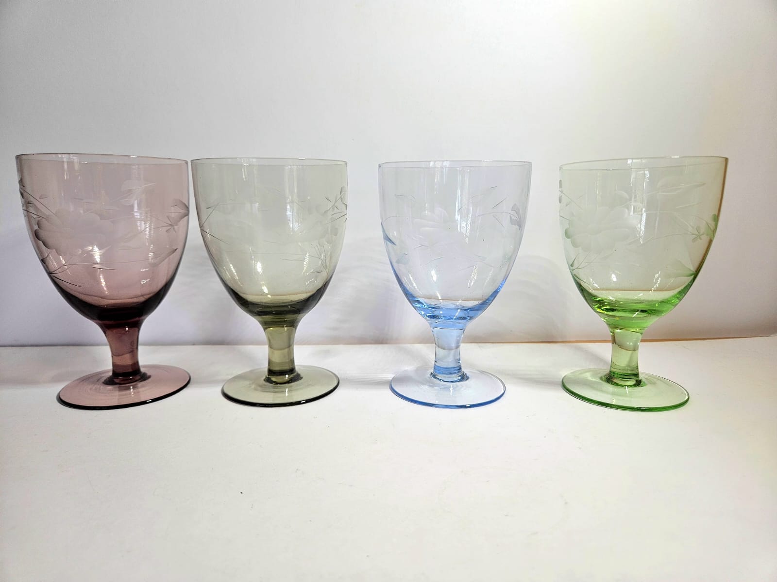 Brighten your table setting with this set of four Harlequin short-stemmed wine glasses, a true vintage finds from 1957. Each glass showcases an elegant etched floral pattern, adding a touch of sophistication to your gatherings.