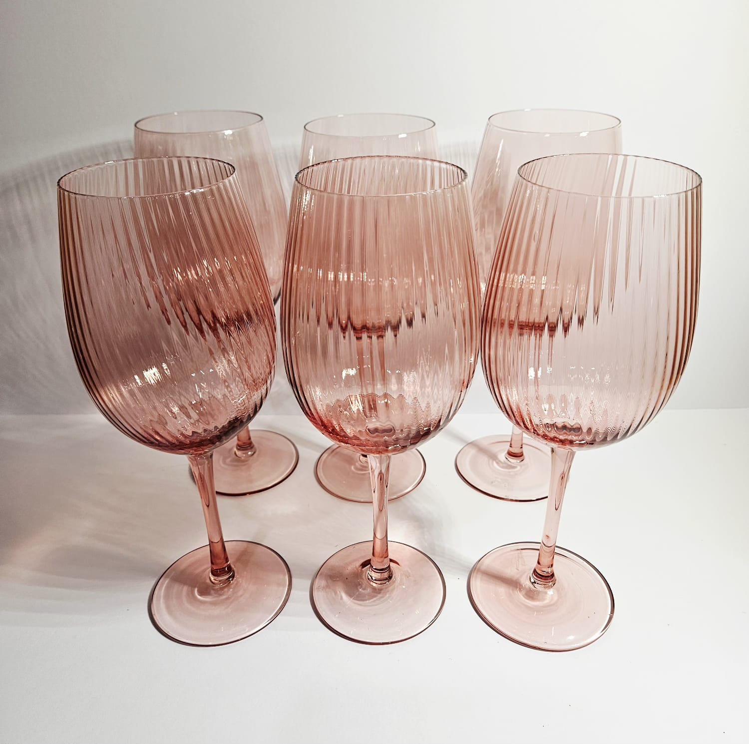 6pc Tempa Thalia 420ml Stemmed Crystal Wine Glass - Pink Quartz- Opalescent electroplated finish, which reflects gorgeously in light- High-quality lead-free crystal - Elegant thin ribbed design. Due to the hand-crafted nature of these items, it can feature natural and unique imperfections, making it one of a kind. 3 glasses display strong ribs and 3 glasses have more subdued ribs ( see photos of the two glases for the difference)