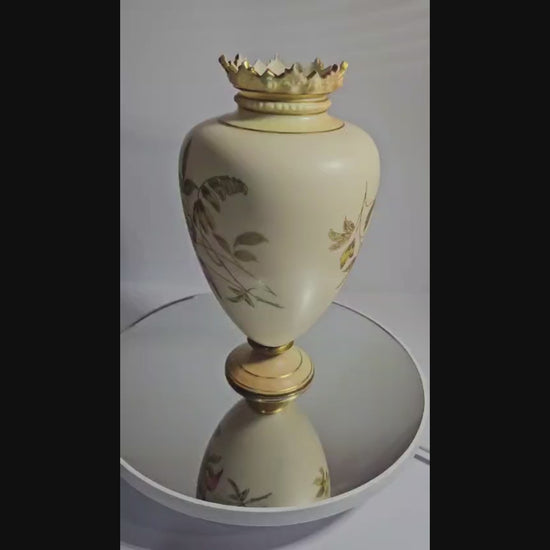 The blush ivory porcelain provides a delicate canvas for the hand-painted floral decorations, accented with intricate gilt detailing. Royal Worcester produced Blush Ivory Vases from 1862 to 1914