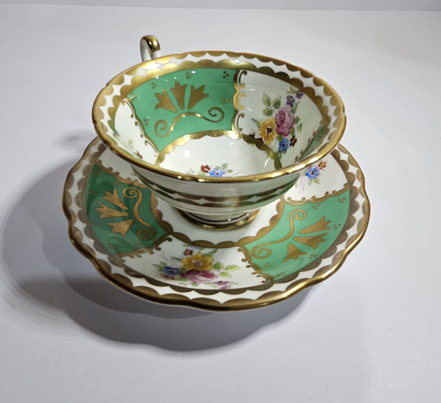 E.B. Foley Green and White Panel Teacup and Saucer with Flowers c.1970