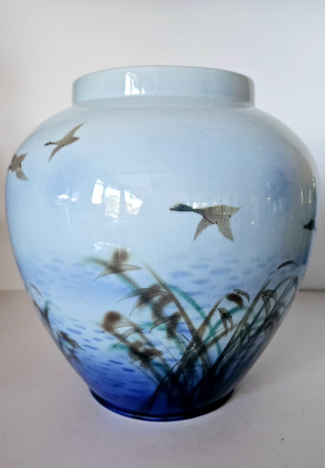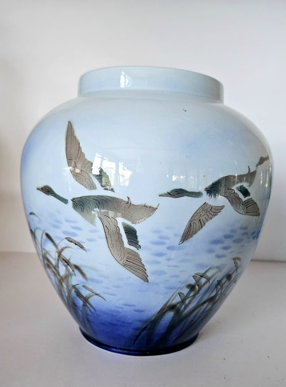 This is a T. Lawrence Falcon Ware round vase. It features a hand-painted scene of flying Mallard ducks on both sides in shades of beige and brown against a glazed blue finish.