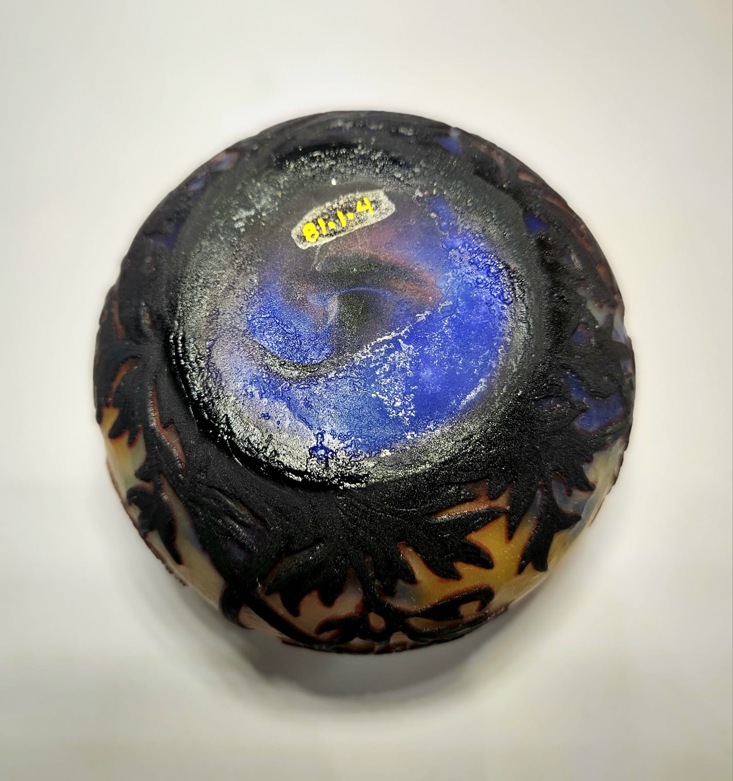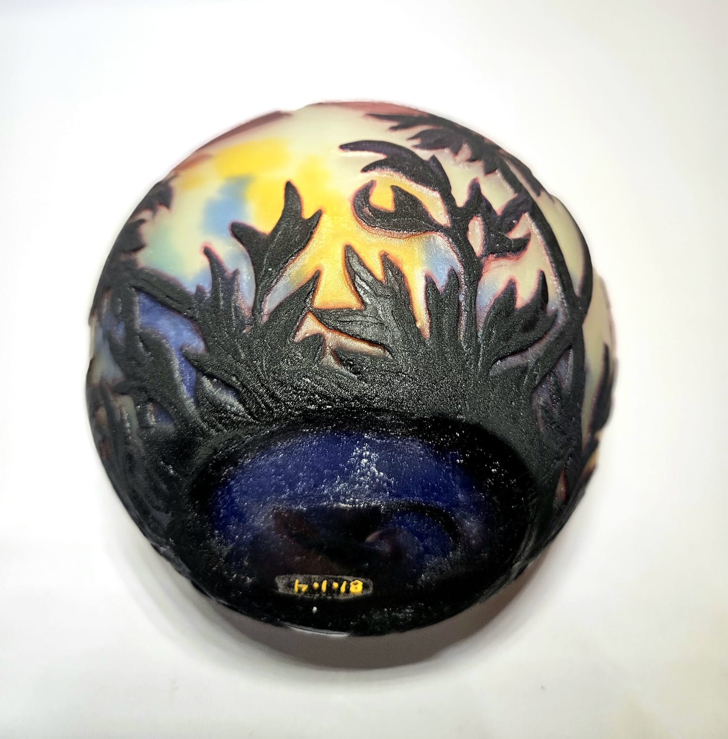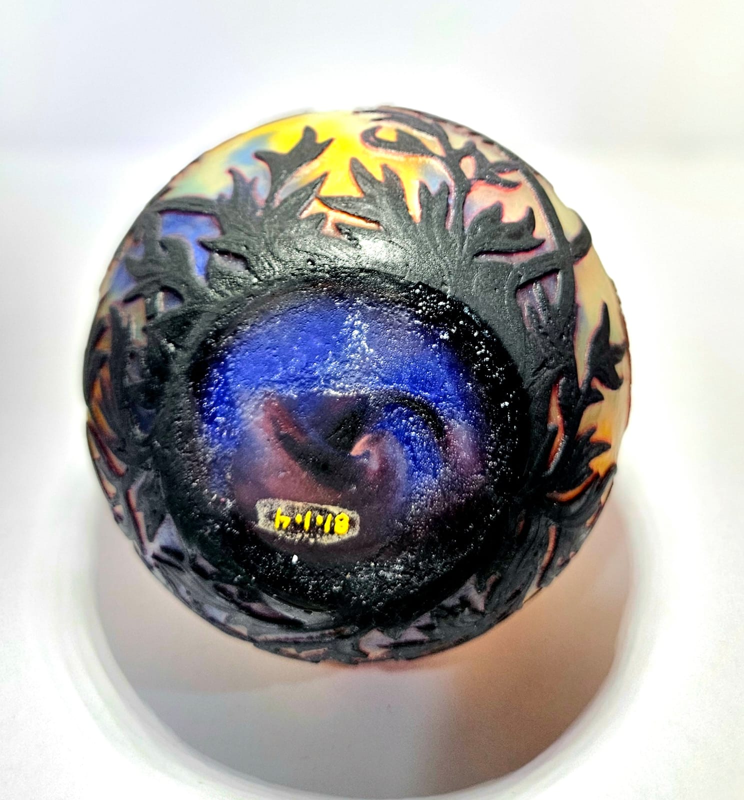 Frères MULLER (1897-1936), a rare multi-layer glass vase (triple thickness) with acid-etched decoration and reworked with a wheel depicting poppies in burgundy and purple, with dark burgundy foliage on a satin white opal underlay background clouded with rich colors, flaky powder melting in yellow and blue simulating an impressionist landscape. Circa 1920