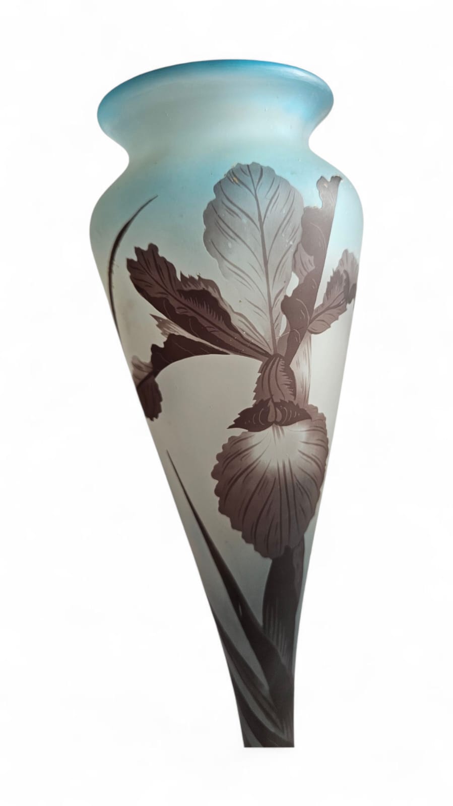 The vase features a slender, baluster shape with a pale blue body overlaid with a mauve/brown iris design.