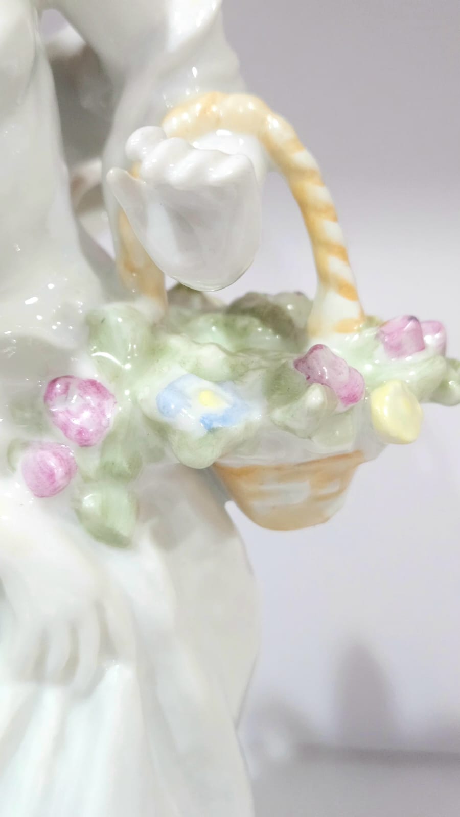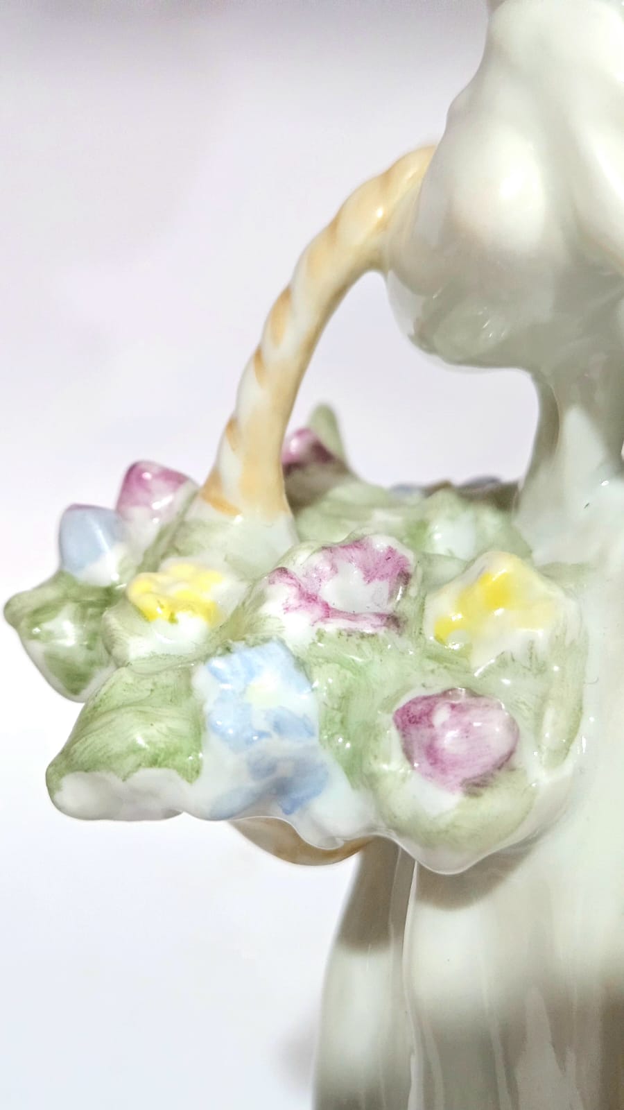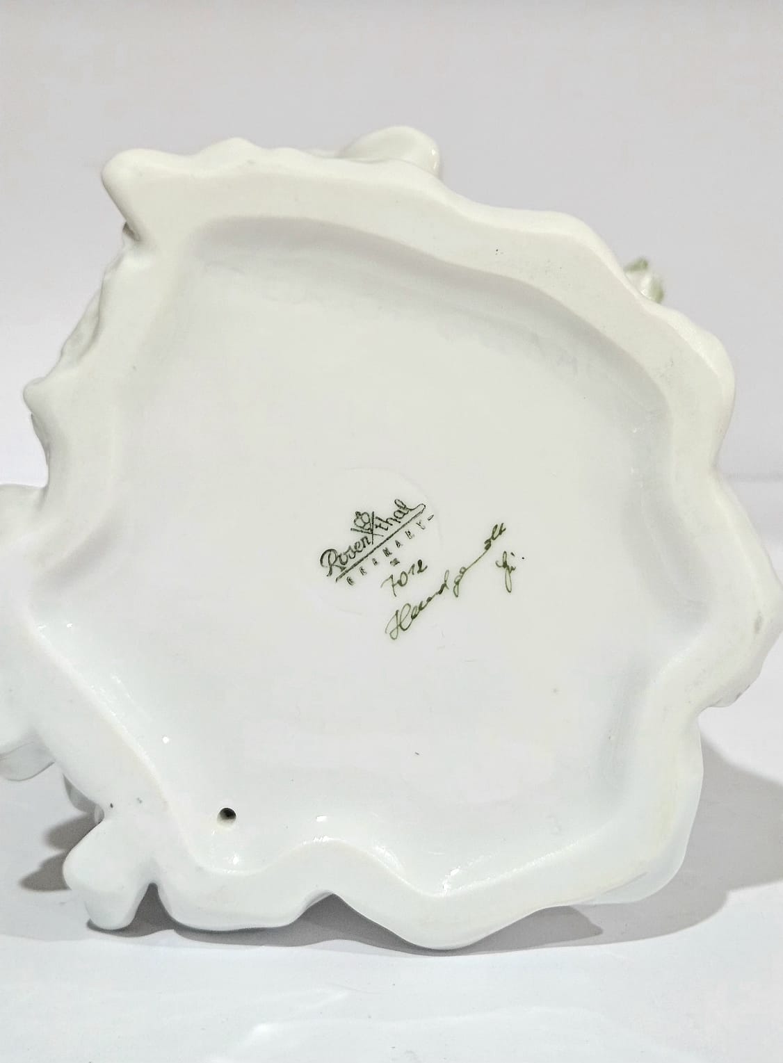 This whimsical, hand-painted Rosenthal porcelain figurine from the 1950s shows Snow White accompanied by a dwarf with a basket of flowers.