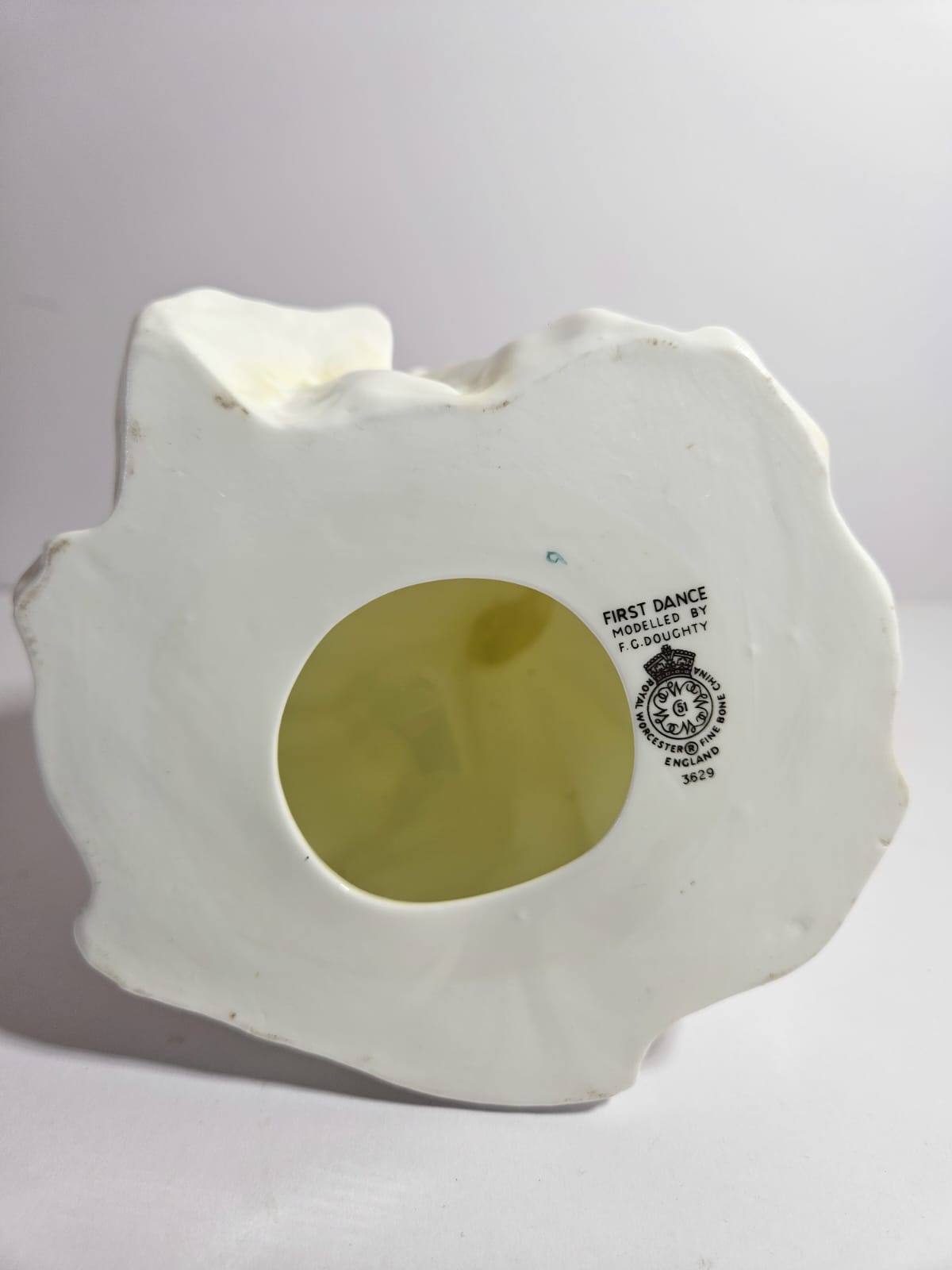 Designed by leading artist Freda Doughty, this lovely Royal Worcester English Porcelain Figurine, “First Dance” RW 3629, was produced from 1957 to 1983.