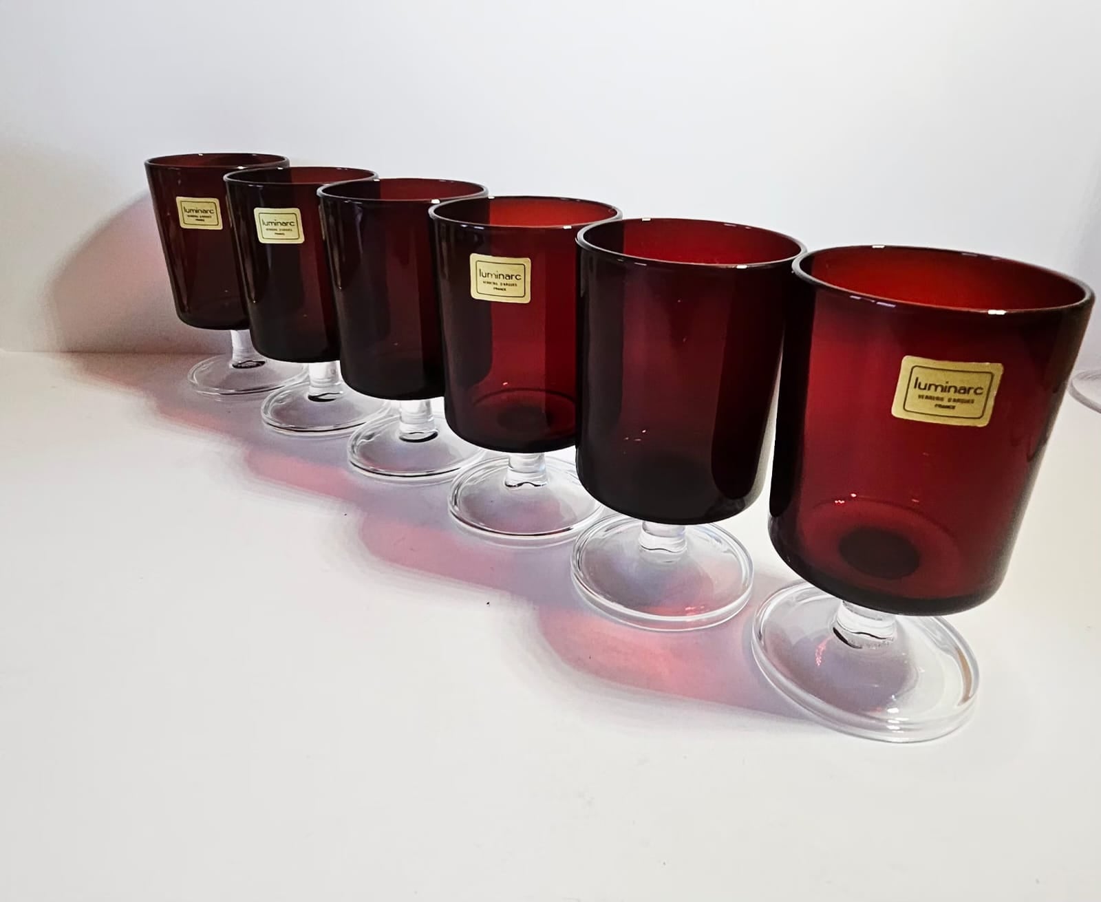 These 6 x Cavalier Ruby red liqueur glasses were produced by Luminarc in France in the 1970s and designed by J.C. Durand.