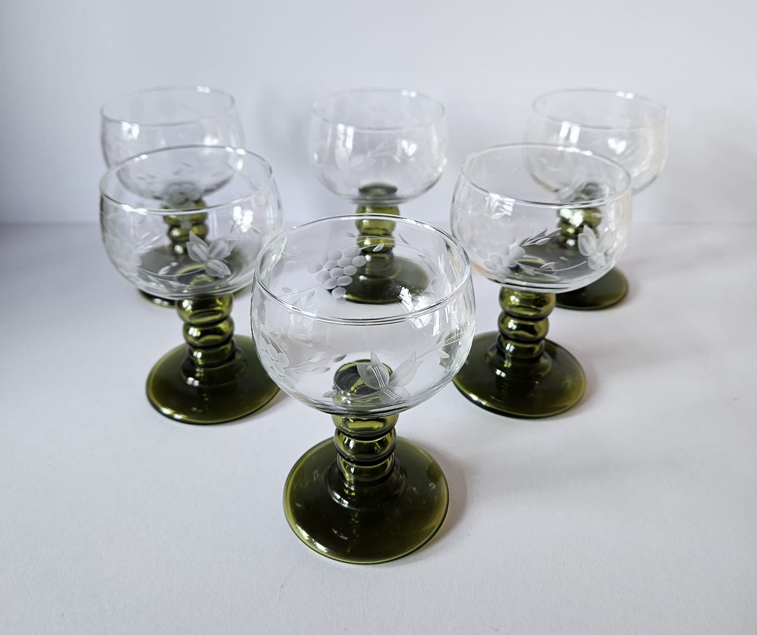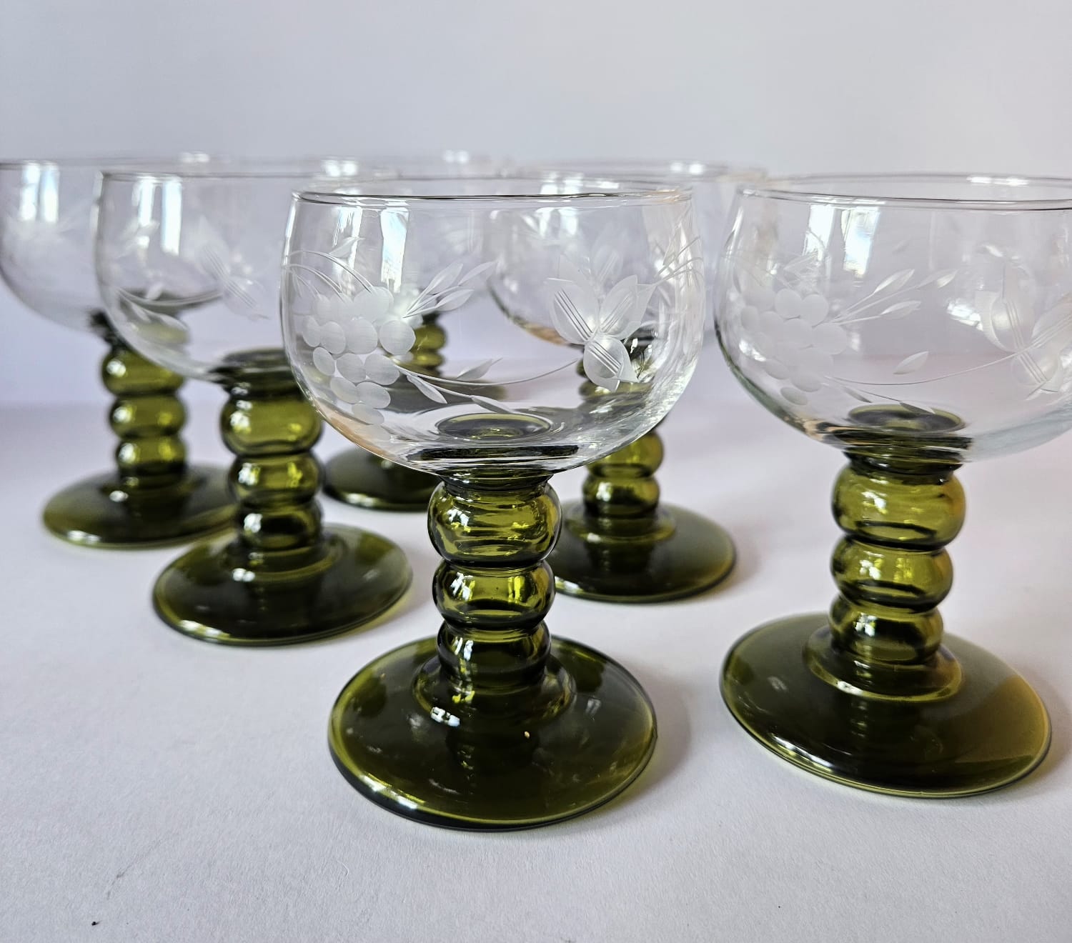 Set of 6 Vintage German Roemer Wine Glasses Olive Green stem, etched