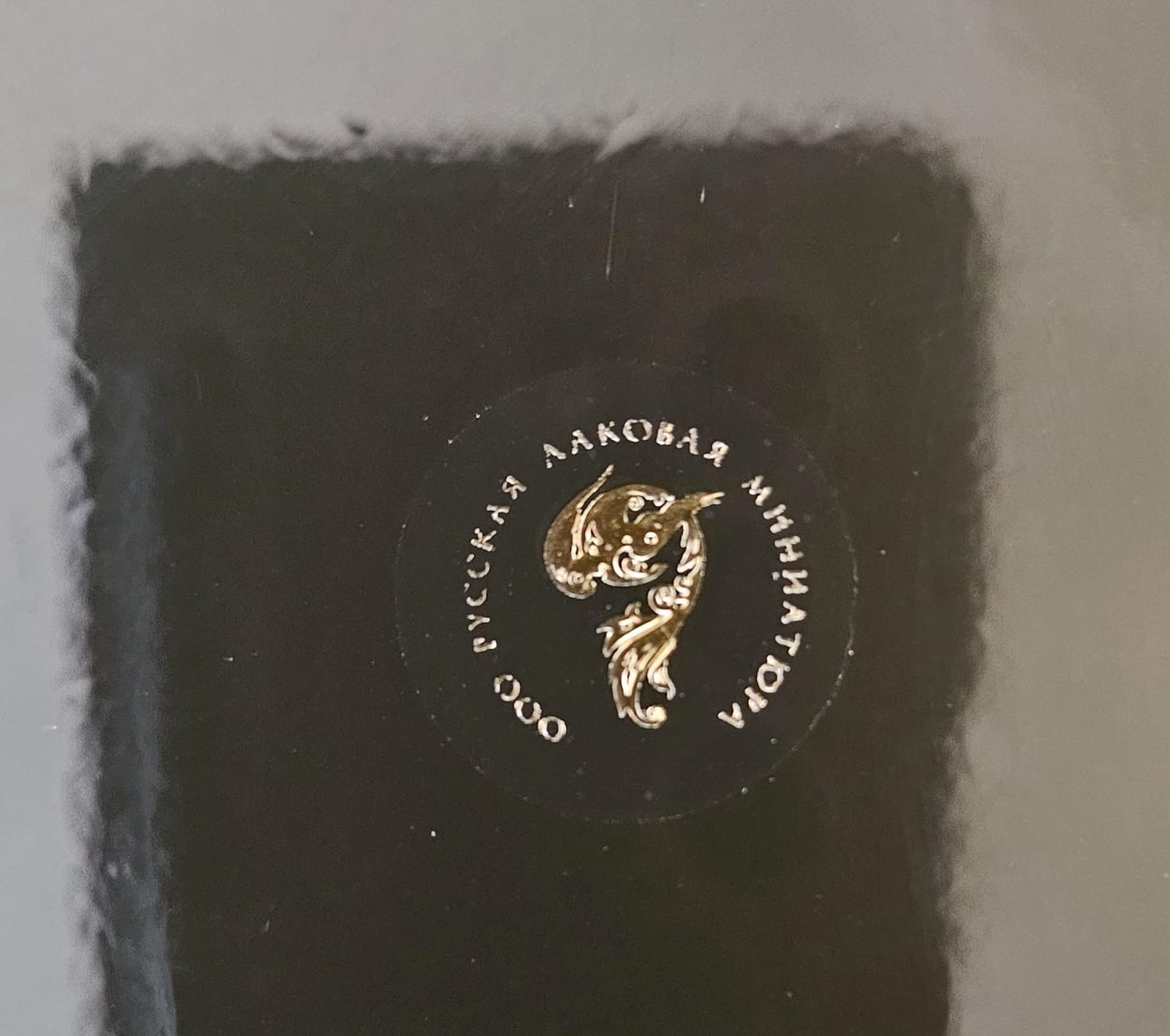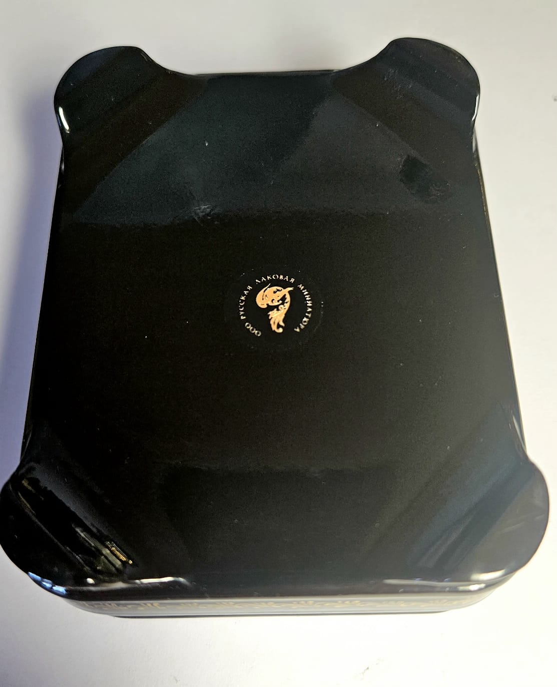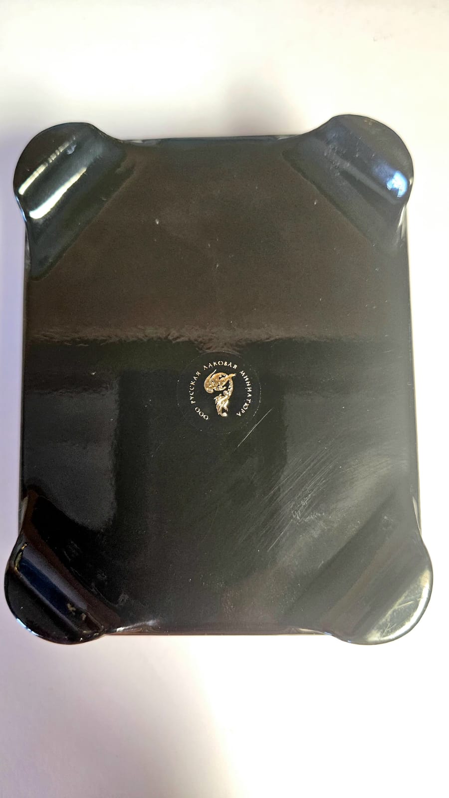 These boxes are typically made from papier-mâché and feature intricate miniature paintings, often depicting scenes from Russian folklore or daily life. The signature visible in the image is in Russian script.