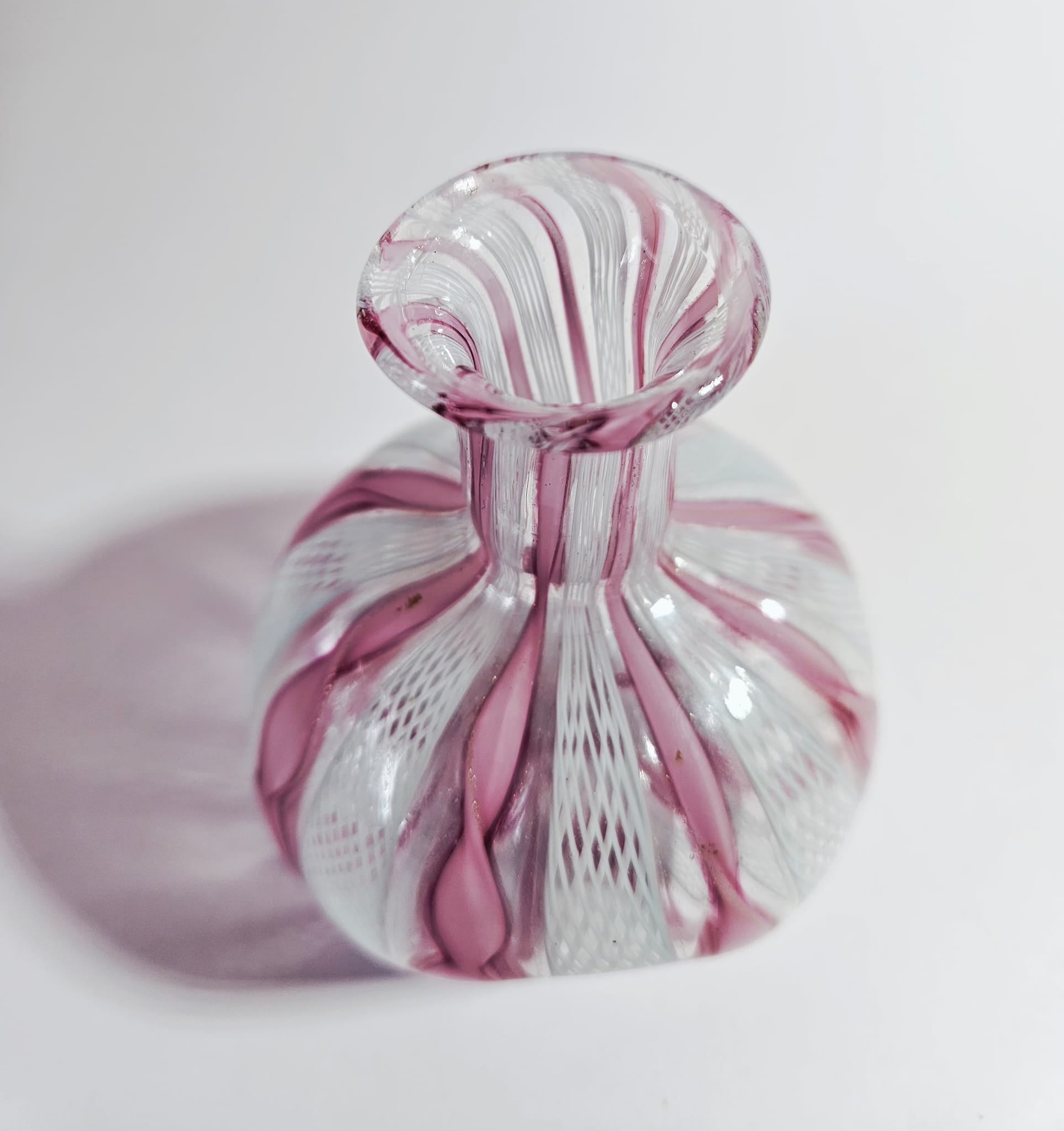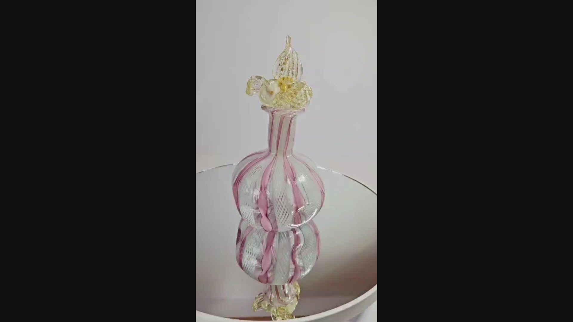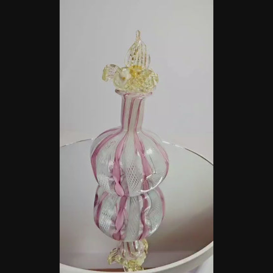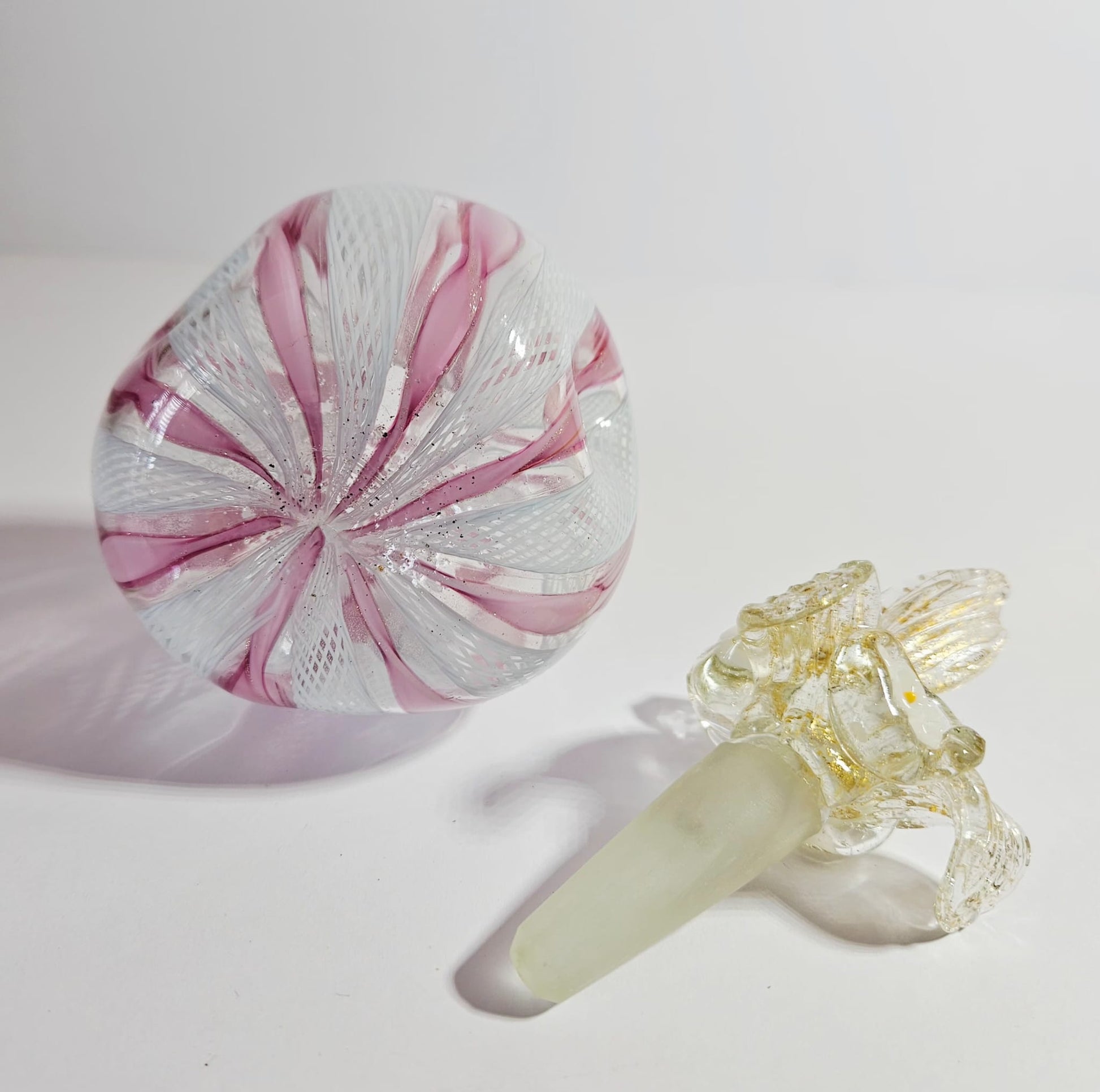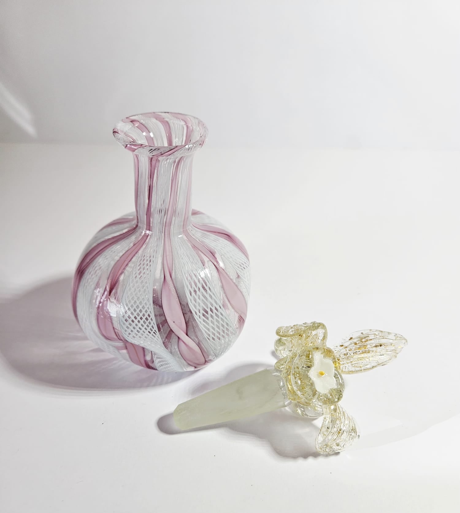 Vintage Murano Pink & White Latticino Art Glass Perfume Bottle with Floral Stopper