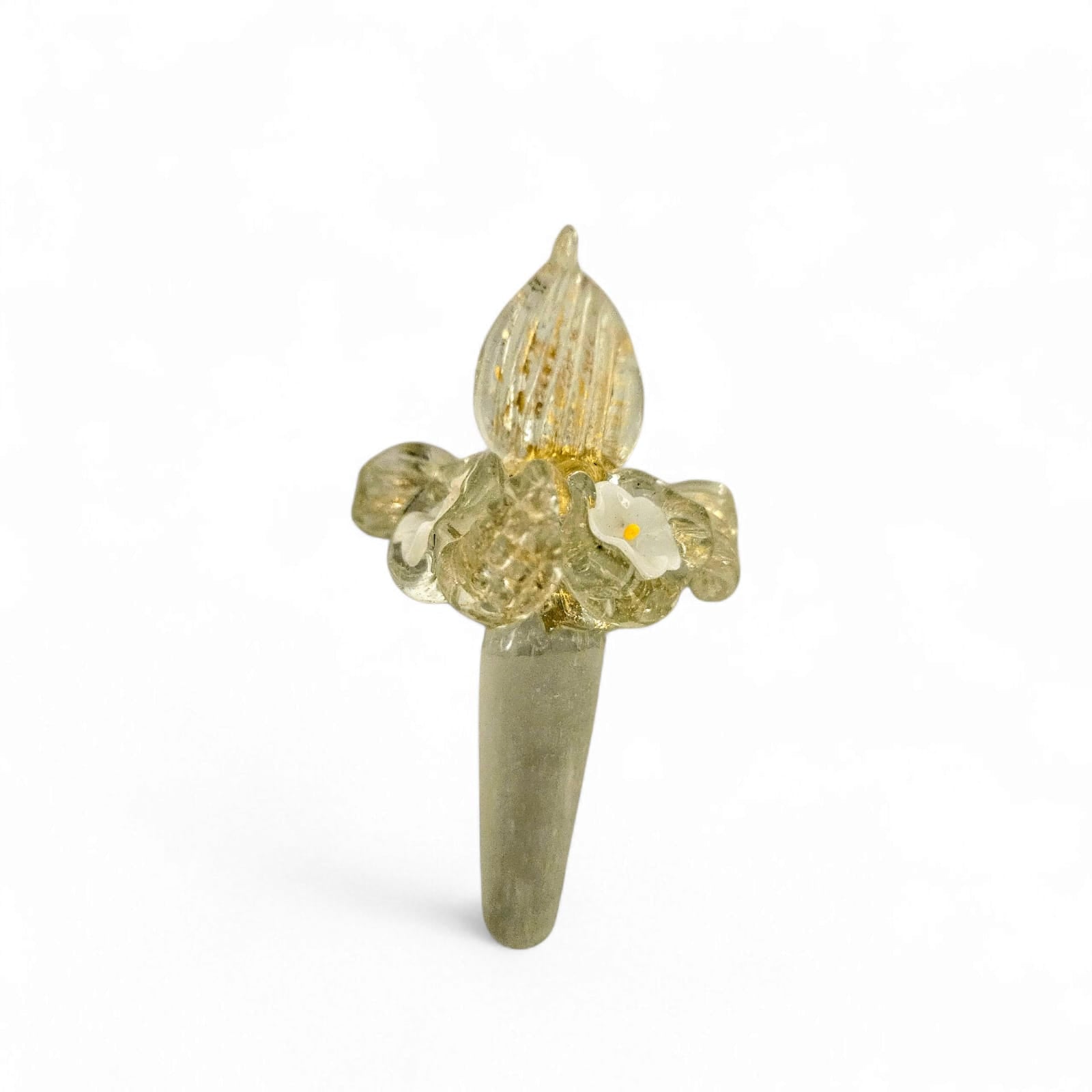 Crafted with meticulous attention to detail, this vintage Murano Glass Latticino perfume bottle is a true testament to the timeless artistry of Italian glasswork. The piece features a delicate lace ribbon motif, exquisitely captured in a stunning blend of pink and white colors. The stopper is crafted into a floral design with applied aventurine.