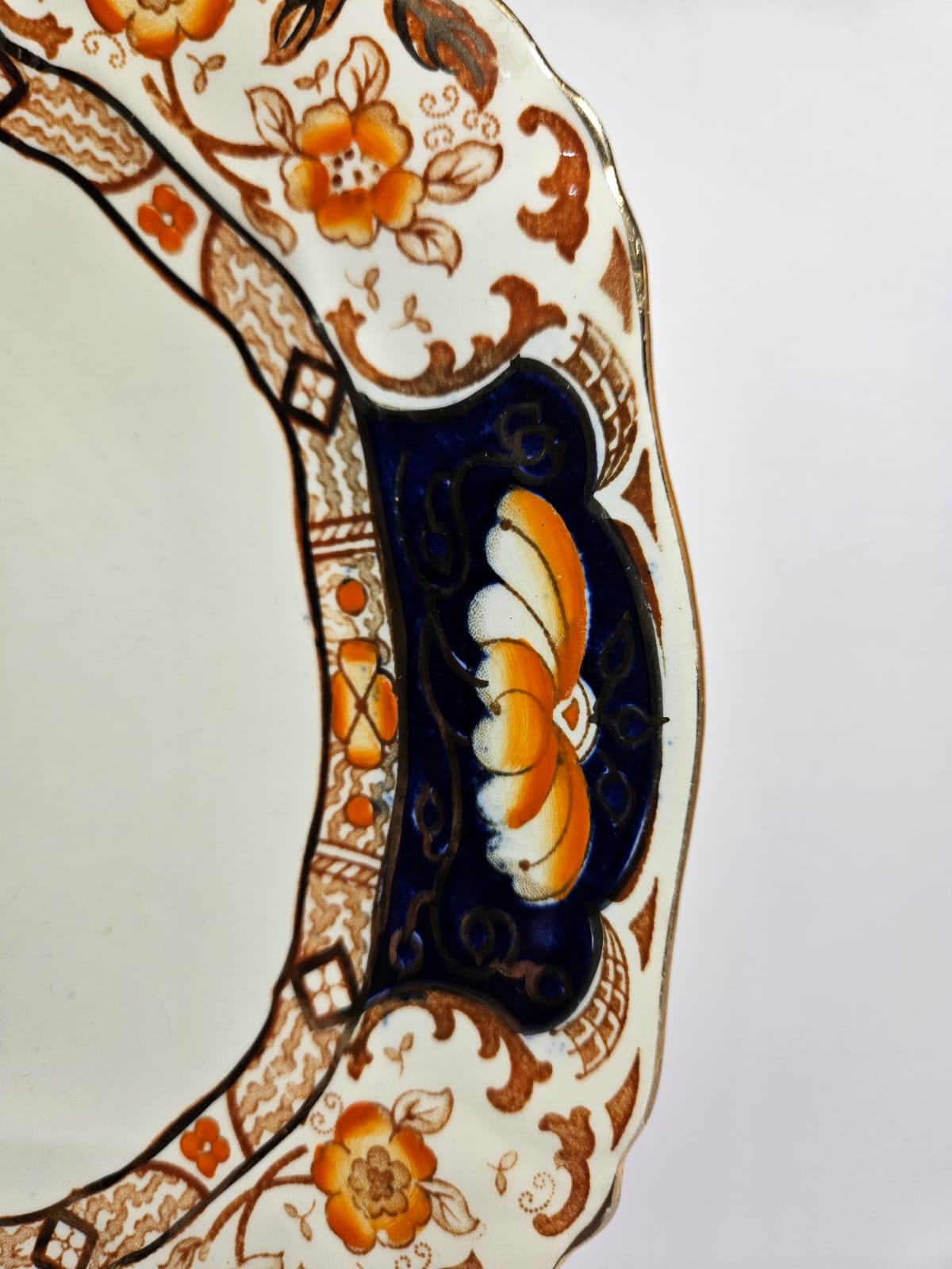 The Vintage Royal Cameron Alfred Meakin English China 16pcs Tea set features a classic gilded floral pattern on round blue cups. Made of English bone china with 18kt gold accents, the set is perfect for serving tea in an elegant and timeless manner.